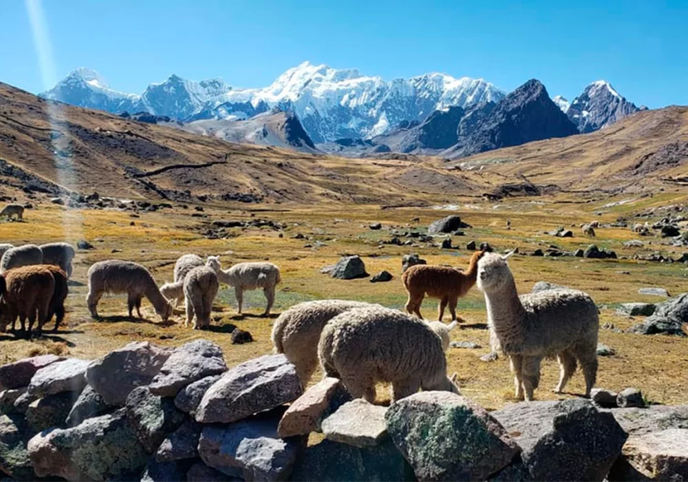 El sendero atraviesa montañas, quebradas y llanuras altoandinas donde podrás observar alpacas, llamas, aves y vistas privilegiadas del Ausangate, uno de los Apus sagrados más importantes del Perú.