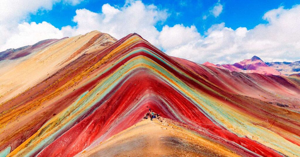 A más de 5,200 msnm, la famosa Rainbow Mountain te espera con un espectáculo natural que parece sacado de un lienzo, producto de minerales que pintan el paisaje en tonos rojos, turquesas, amarillos, lavanda y ocres.